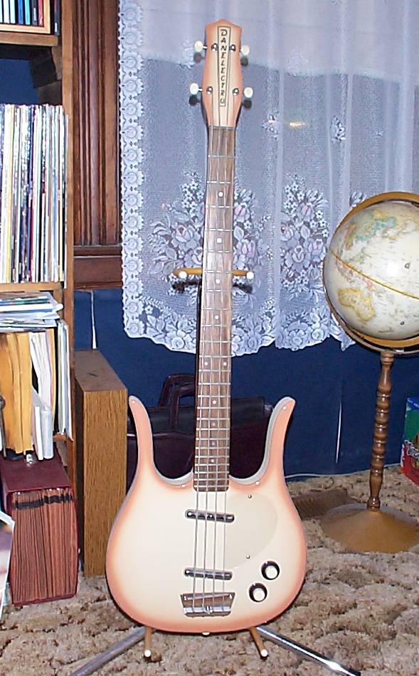 This may be the ugliest bass guitar ever made. It’s the Dan Electro Longhorn. In spite of it’s funny appearance, it sounds and plays quite well. The body seems to mostly be made of some kind of plastic. It shouldn’t sound good, but for some reason, it does.